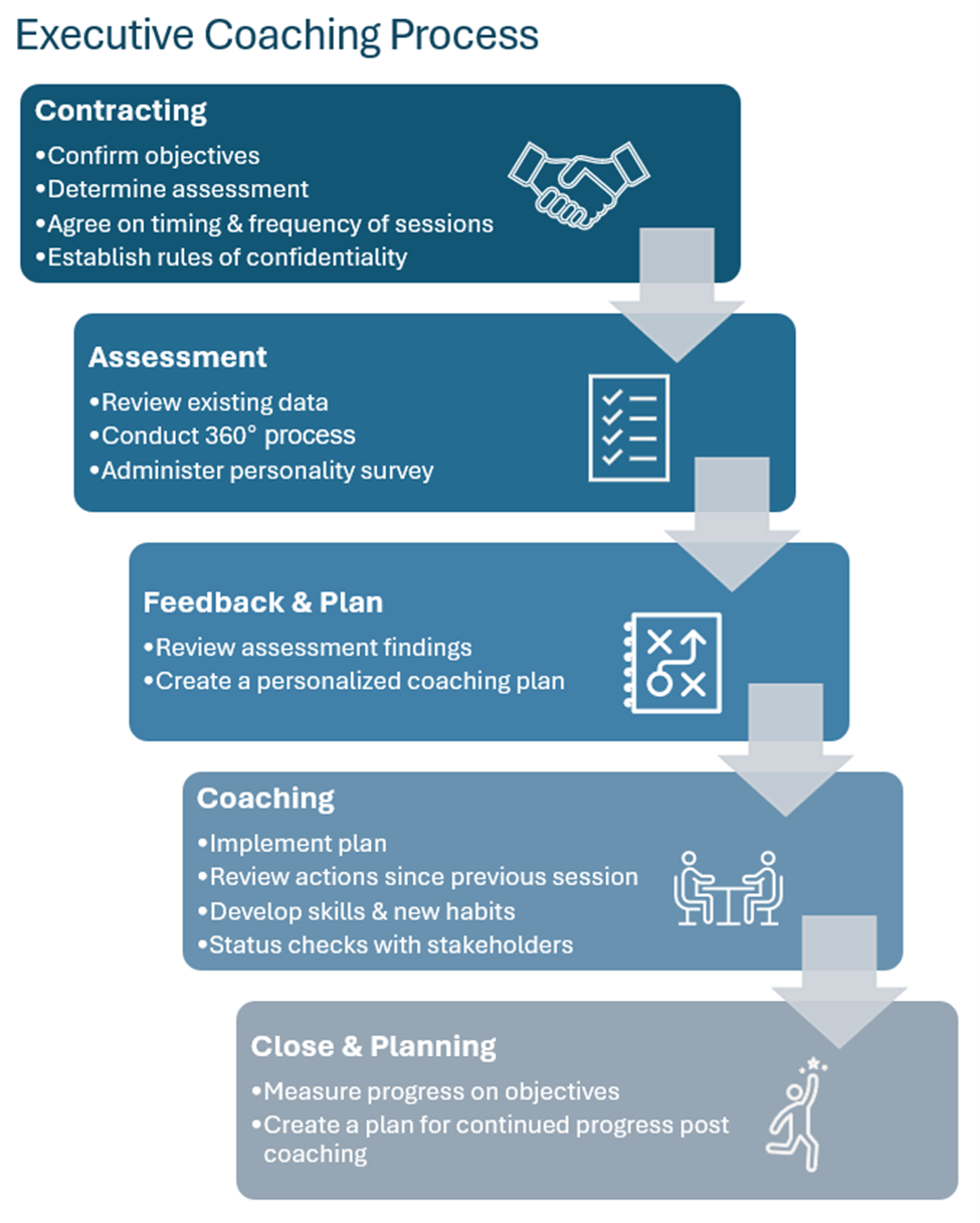 - Business savvy developed over decades to inform context and ensure the coaching delivers personal change in the service of business outcomes